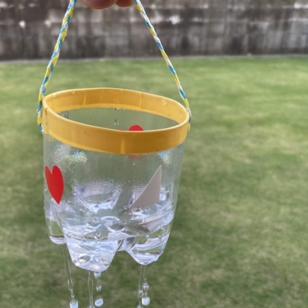 ペットボトルを切り、切り口にビニールテープをまきます。キリなどで穴をあけ、持ち手をつければできあがり。